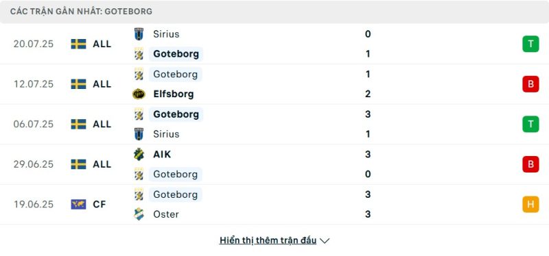 5 trận gần nhất của IFK Göteborg: W-L-W-L-D