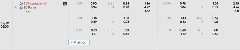 Bảng Tỷ lệ kèo bóng đá Internacional vs Bahia
