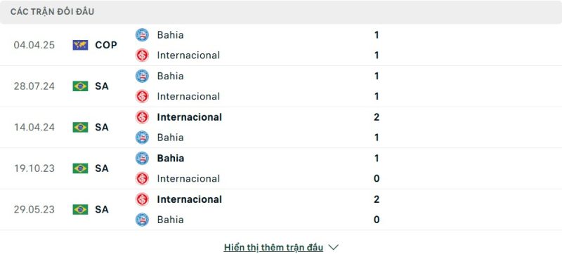 Thành tích đối đầu của Internacional vs Bahia