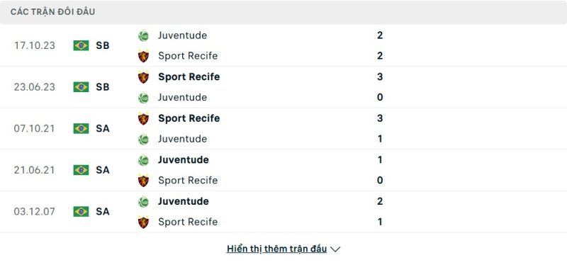 Thống kê phong độ gần đây Juventude vs Sport Recife