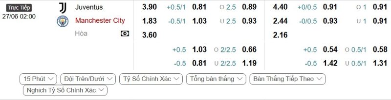 Bảng Tỷ lệ kèo bóng đá Juventus vs Manchester City
