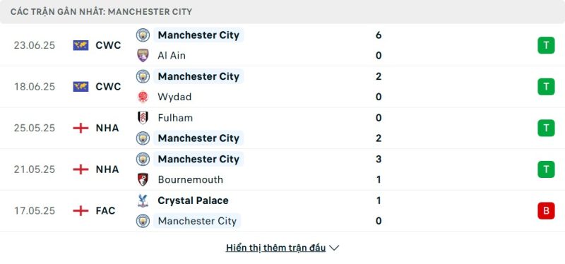 5 trận gần nhất của Manchester City: W-W-W-W-L