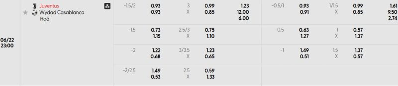 Bảng Tỷ lệ kèo bóng đá Juventus vs Wydad Casablanca