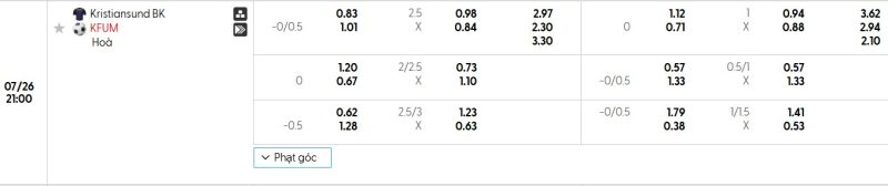 Bảng Tỷ lệ kèo bóng đá Kristiansund vs KFUM