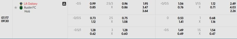 Bảng Tỷ lệ kèo bóng đá LA Galaxy vs Austin FC