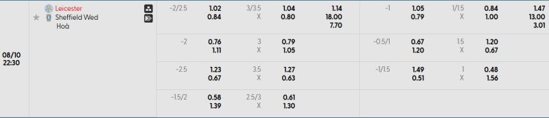 Bảng Tỷ lệ kèo bóng đá Leicester City vs Sheffield Wednesday