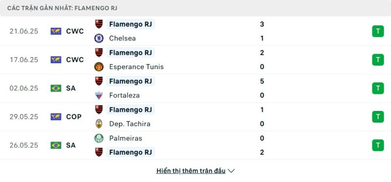 5 trận gần nhất của Flamengo: W-W-W-W-W