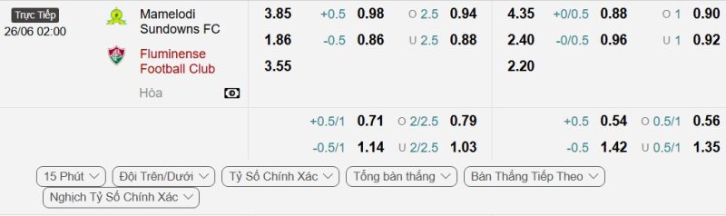 - Kèo tỷ số bóng đá hiệp 1: Mamelodi Sundowns 1-1 Fluminense