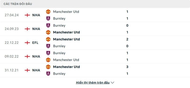 Thành tích đối đầu của Manchester United vs Burnley