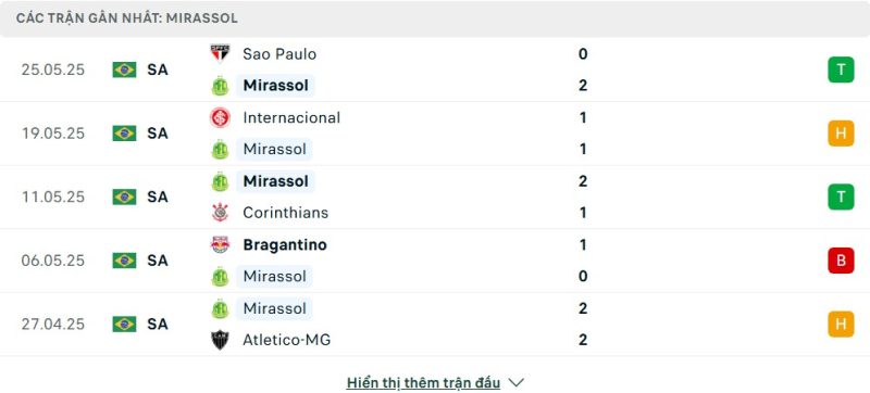 Thống kê phong độ gần đây Mirassol vs Sport Recife