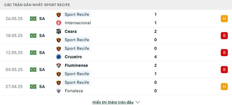5 trận gần nhất của Sport Recife: D-L-L-L-D