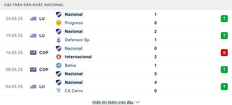 5 trận gần nhất của Nacional: W-W-L-W-W