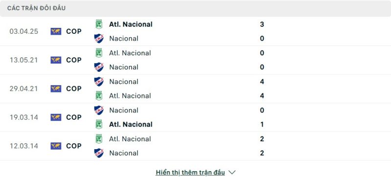 Thành tích đối đầu của Nacional vs Atlético Nacional