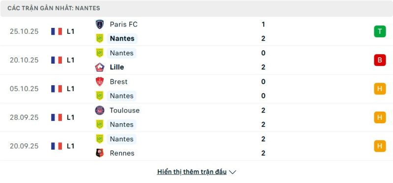 Nantes bước vào vòng đấu này với vị trí thứ 13 trên bảng xếp hạng, sau chuỗi trận có phần thiếu ổn định. Trong 9 trận gần nhất, họ thắng 2, hòa 3 và thua 4, giành tổng cộng 9 điểm. Điểm sáng đáng kể là chiến thắng 2-1 ngay trên sân Paris, giúp toàn đội lấy lại phần nào sự tự tin. Tuy nhiên, hàng công của Nantes mới chỉ ghi được 7 bàn, con số khiêm tốn so với mặt bằng chung. Trên sân nhà, đội bóng áo vàng vẫn cho thấy sự khó chịu, song việc đánh rơi điểm trước Lille hay Rennes cho thấy họ vẫn chưa thật sự ổn định.