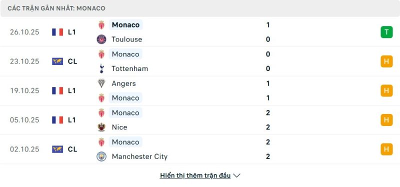 Monaco hiện đứng thứ 4 tại Ligue 1 với 17 điểm sau 9 vòng đấu. Đội bóng xứ Công quốc thể hiện phong độ khá tích cực, thắng 5, hòa 2 và chỉ thua 2 trận. Đáng chú ý, họ vừa vượt qua Toulouse 1-0 và cầm hòa Tottenham lẫn Man City ở Champions League, cho thấy khả năng phòng ngự được cải thiện rõ rệt. Dù vậy, Monaco lại thường gặp khó khăn khi làm khách, đặc biệt trước những đối thủ chơi chặt chẽ. Chuỗi trận hòa liên tiếp gần đây phần nào cho thấy họ chưa thực sự bùng nổ như giai đoạn đầu mùa, nhưng vẫn duy trì được vị thế trong nhóm dẫn đầu.