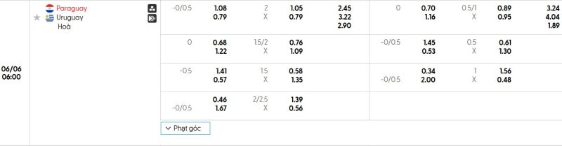 Bảng Tỷ lệ kèo bóng đá Paraguay vs Uruguay