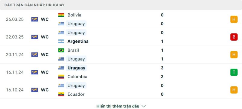 5 trận gần nhất của Uruguay: D-L-D-W-D