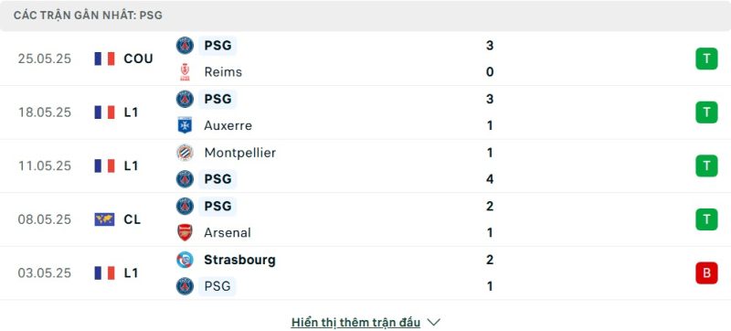 5 trận gần nhất của Paris Saint-Germain: W-W-W-W-L