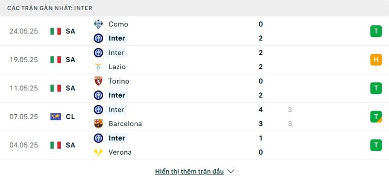 5 trận gần nhất của Inter: W-D-W-D-W