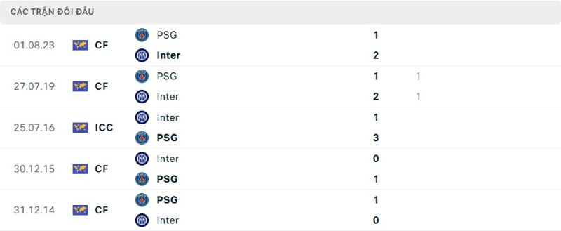 Thành tích đối đầu của Paris Saint-Germain vs Inter