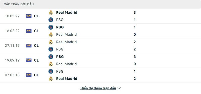 Thành tích đối đầu của Paris Saint-Germain vs Real Madrid