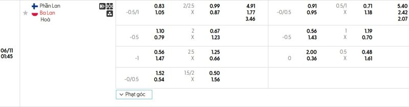 Bảng Tỷ lệ kèo bóng đá Phần Lan vs Ba Lan