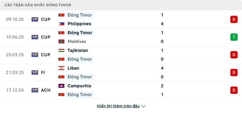 5 trận gần nhất của Timor-Leste: L-W-L-L-L
