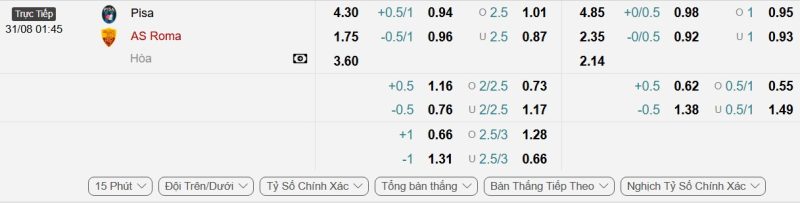 Bảng Tỷ lệ kèo bóng đá Pisa vs Roma