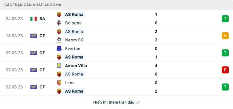 Bên kia chiến tuyến, Roma đã khởi đầu mùa giải một cách hoàn hảo bằng việc giành trọn 3 điểm sau chiến thắng tối thiểu 1-0 trước Bologna. Kết quả này giúp họ tạm thời có được vị trí thứ 6 trên bảng xếp hạng và tạo ra một bước đệm tâm lý thuận lợi. Phong độ của đội bóng thủ đô trong loạt trận giao hữu mùa hè cũng rất cao với hàng loạt chiến thắng ấn tượng trước Everton, Lens hay Cannes. Dù có một thất bại đậm trước Aston Villa, nhưng nhìn chung đoàn quân áo bã trầu vẫn cho thấy sự ổn định và sẵn sàng cho những thử thách.