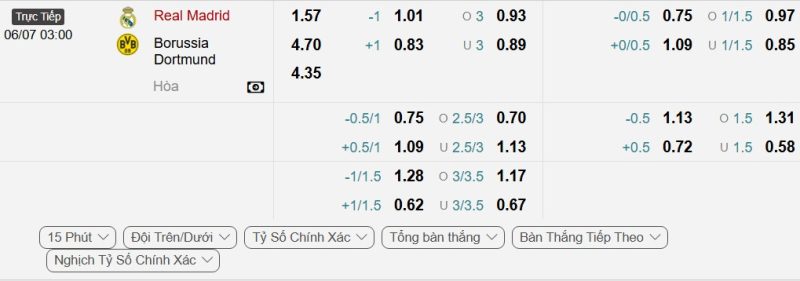Nếu Dortmund nhập cuộc tự tin và tận dụng tốt những khoảnh khắc mất tập trung của đối thủ, khả năng họ có bàn thắng dẫn trước trong hiệp một là hoàn toàn có thể xảy ra. Hàng thủ của Real Madrid dù giàu kinh nghiệm nhưng đôi khi vẫn để lộ khoảng trống khi bị pressing. Đây sẽ là thời điểm Dortmund khai thác bằng tốc độ và sự di chuyển khôn ngoan của các cầu thủ tuyến đầu. Mức kèo tài xỉu mà nhà cái niêm yết là 1.25 với tỷ lệ cho tài là 0.97, tỷ lệ cho xỉu là 0.85, người chơi nên đặt niềm tin vào cửa xỉu cho hiệp đấu này.