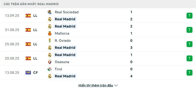 Real Madrid bước vào mùa giải mới với sự hưng phấn lớn khi chuỗi trận gần đây của họ rất tích cực. Đội bóng Hoàng gia Tây Ban Nha đã toàn thắng bốn trận liên tiếp tại LaLiga, trong đó có các kết quả nổi bật như đánh bại Real Sociedad và Mallorca, cho thấy sự ổn định cả trên sân nhà lẫn sân khách. Ở FIFA Club World Cup, Real Madrid cũng khẳng định vị thế khi vượt qua Dortmund và Juventus bằng những trận thắng thuyết phục. Dù có một thất bại trước PSG, nhìn chung đội bóng này vẫn đang duy trì phong độ cao, chứng tỏ sự sẵn sàng cạnh tranh ở mọi đấu trường.
