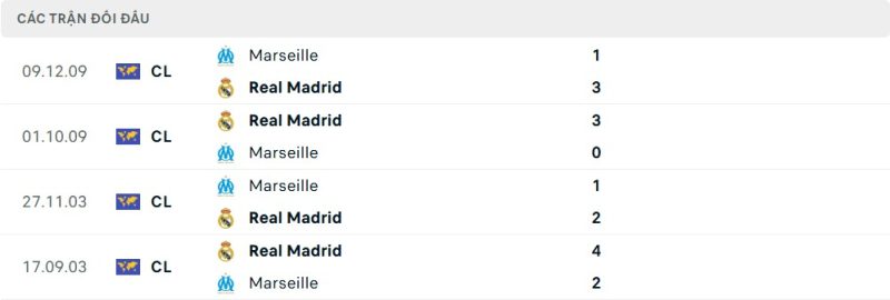 Thành tích đối đầu của Real Madrid vs Marseille