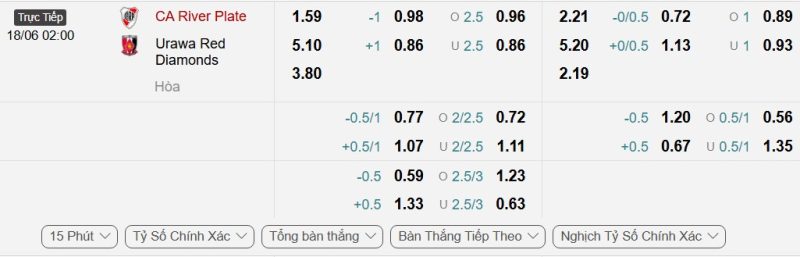 Bảng Tỷ lệ kèo bóng đá River Plate vs Urawa Red Diamonds