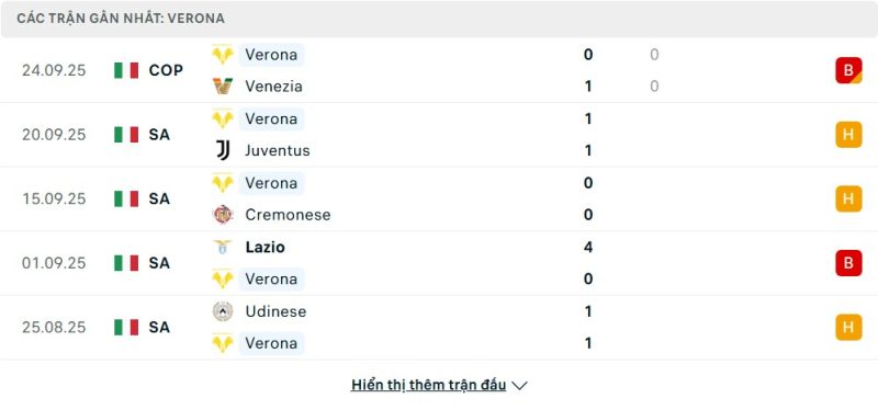 Phong độ của Hellas Verona