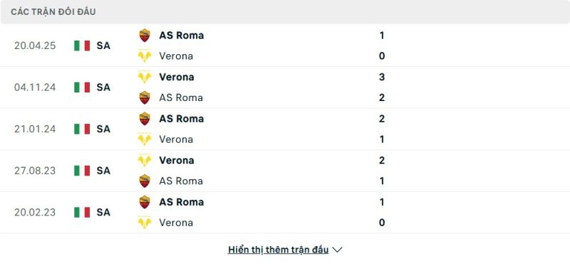 Thành tích đối đầu của Roma vs Hellas Verona