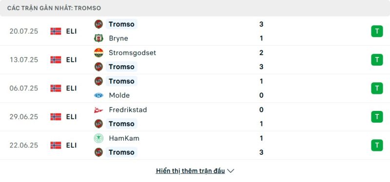 5 trận gần nhất của Tromsø: W-W-W-W-W