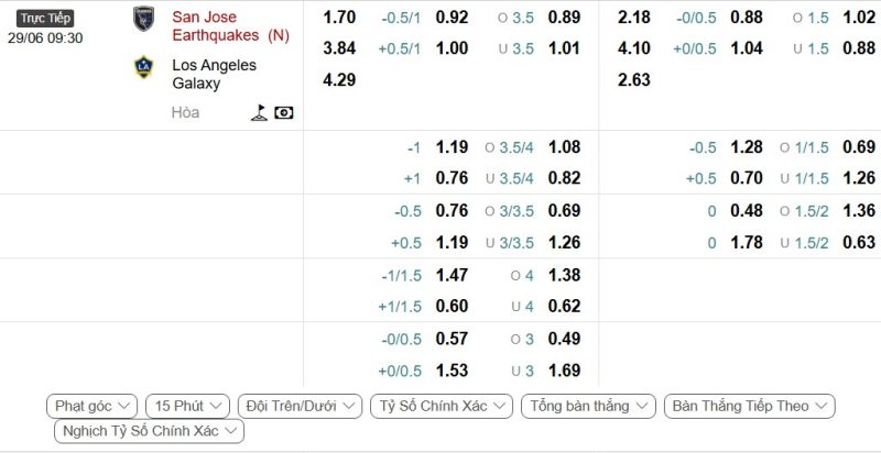 - Kèo tỷ số bóng đá hiệp 1: San Jose Earthquakes 2-2 LA Galaxy