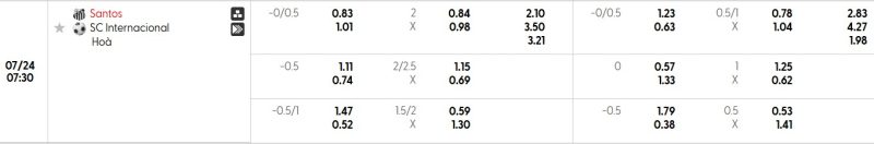 Bảng Tỷ lệ kèo bóng đá Santos vs Internacional