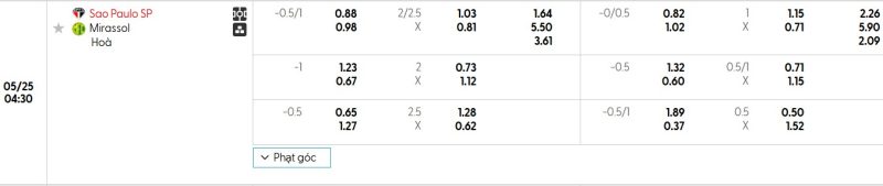 Bảng Tỷ lệ kèo bóng đá São Paulo vs Mirassol