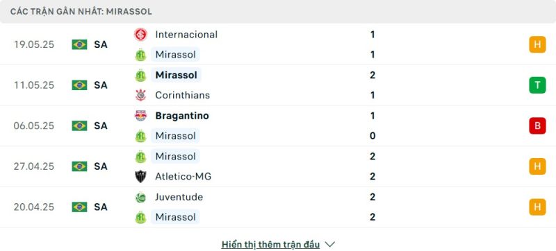 Thống kê phong độ gần đây São Paulo vs Mirassol