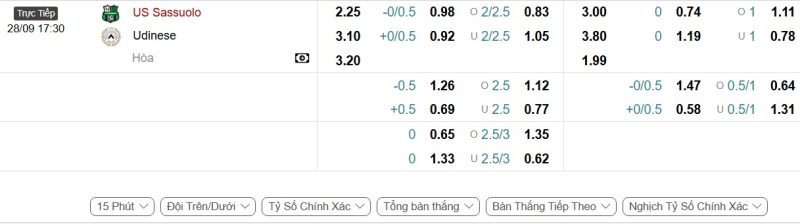 Bảng Tỷ lệ kèo bóng đá Sassuolo vs Udinese