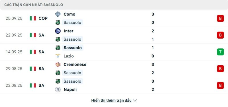 5 trận gần nhất của Sassuolo: L-L-W-L-L