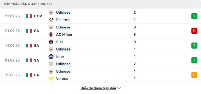Udinese đang có màn trình diễn khá khởi sắc và đứng ở nửa trên bảng xếp hạng với 7 điểm sau 4 vòng đấu. Đội bóng này đã gây bất ngờ khi đánh bại Inter ngay trên sân khách và cũng giành trọn 3 điểm trước Pisa. Dù vậy, thất bại trước Milan cho thấy họ vẫn cần cải thiện nhiều về sự chắc chắn khi gặp những đội bóng lớn. Kết quả hòa Verona cũng phần nào kìm hãm đà thăng tiến, nhưng nhìn chung Udinese vẫn duy trì sự tự tin với lối chơi kỷ luật và hàng công biết cách tận dụng cơ hội.