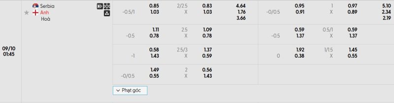 Bảng Tỷ lệ kèo bóng đá Serbia vs Anh