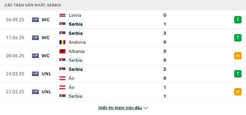 5 trận gần nhất của Serbia: W-W-D-W-D