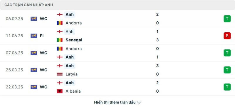 5 trận gần nhất của Anh: W-L-W-W-W