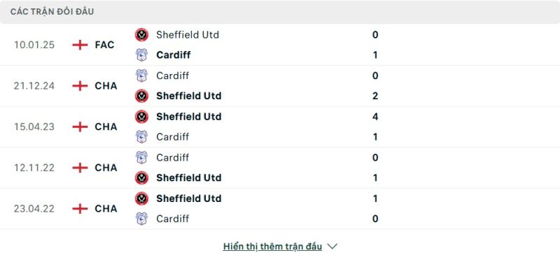 Thành tích đối đầu của Sheffield United vs Cardiff City