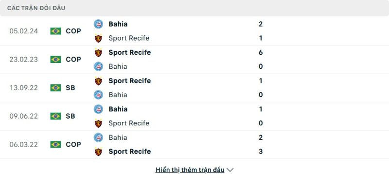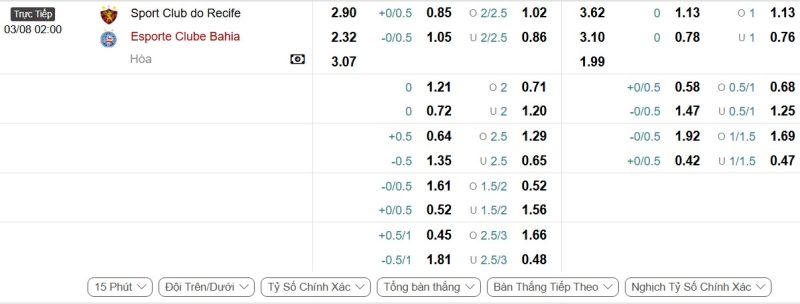 Bảng Tỷ lệ kèo bóng đá Sport Recife vs Bahia