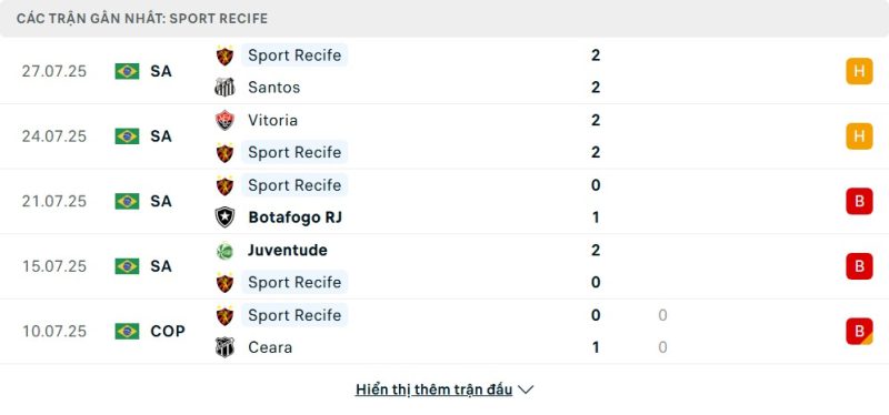 5 trận gần nhất của Sport Recife: D-D-L-L-D