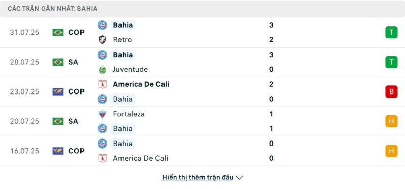 Bên kia chiến tuyến, Bahia lại đang có phong độ ổn định hơn rất nhiều. Với 28 điểm sau 15 trận, họ đang giữ vị trí thứ 4 trên bảng xếp hạng và nằm trong nhóm cạnh tranh suất dự Copa Libertadores. 5 trận đấu gần nhất trên mọi đấu trường, Bahia có 2 chiến thắng, 2 trận hòa và chỉ 1 trận thua. Đáng chú ý, họ vừa giành chiến thắng thuyết phục 3-2 trước Retro và 3-0 trước Juventude, cho thấy sự ổn định và khả năng ghi bàn ấn tượng của đội bóng này.